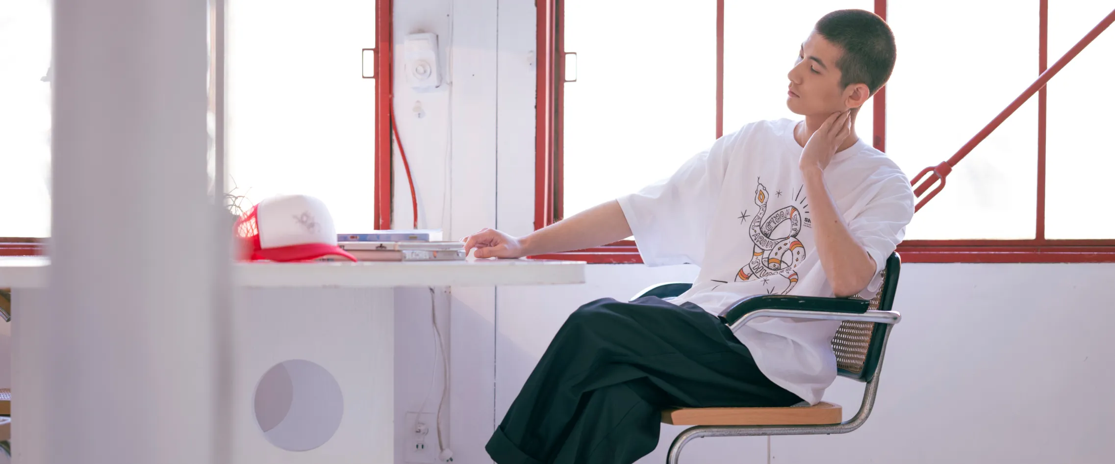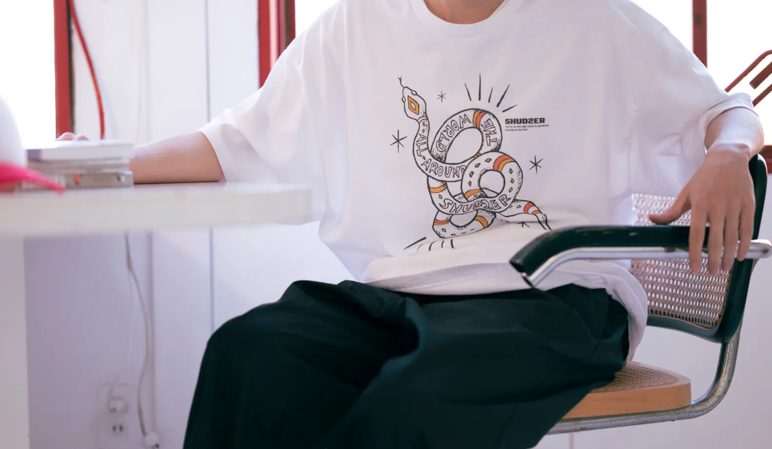 逆にピッタリめを着て、インナーのように使用することも。ちらっとしか見えないインナーだからこそ、ちょっとしたプリントが入っていたら面白いですよね。