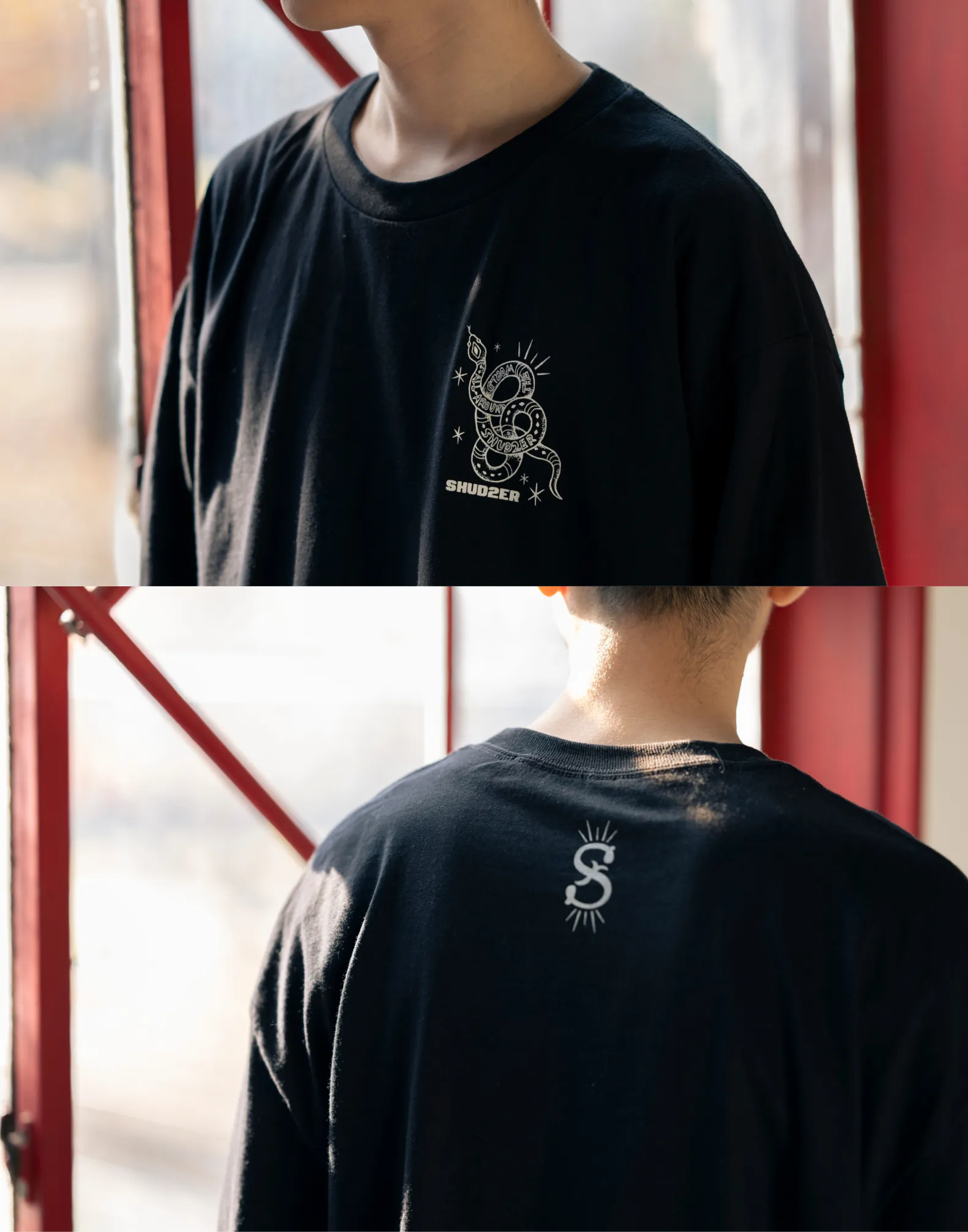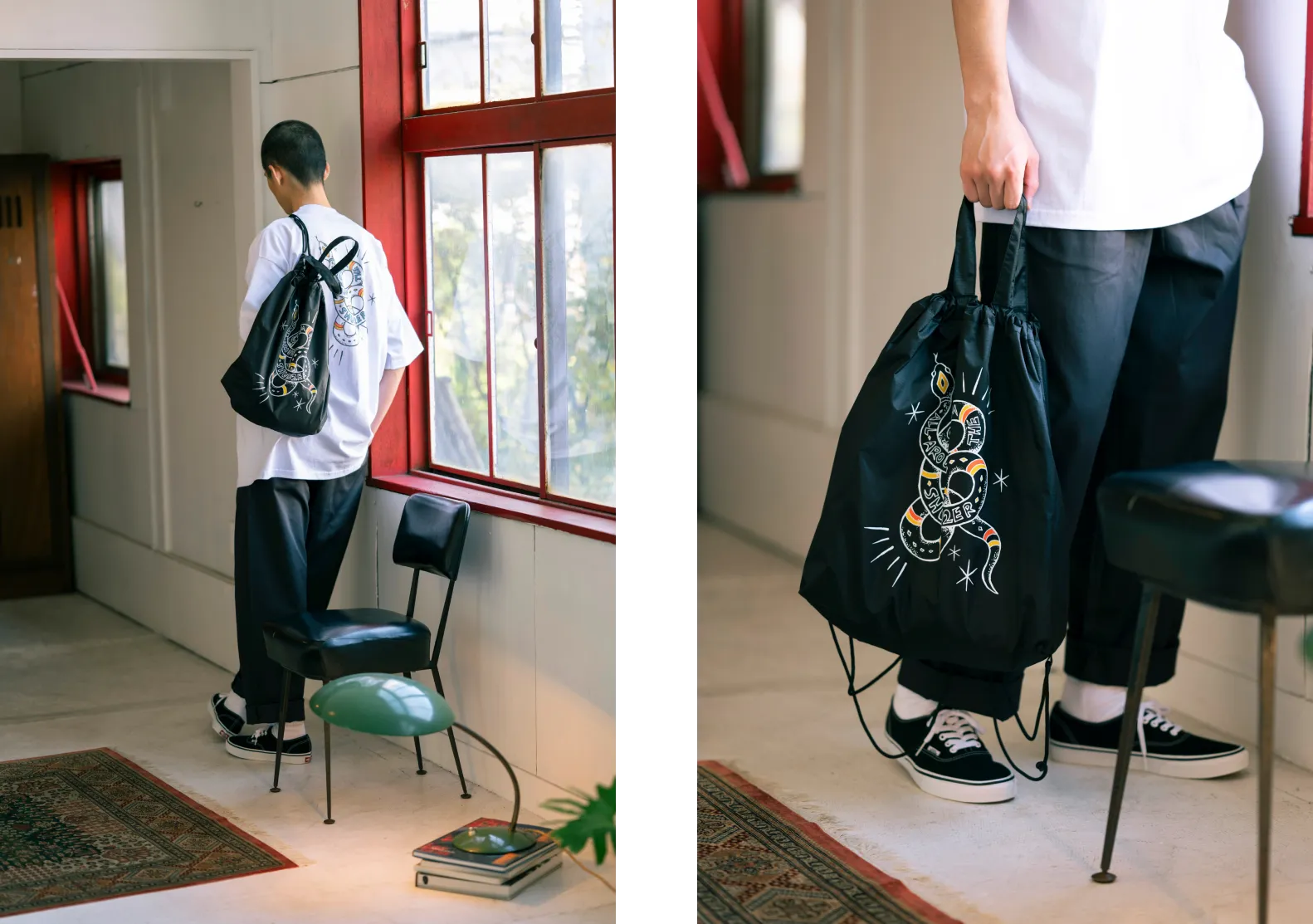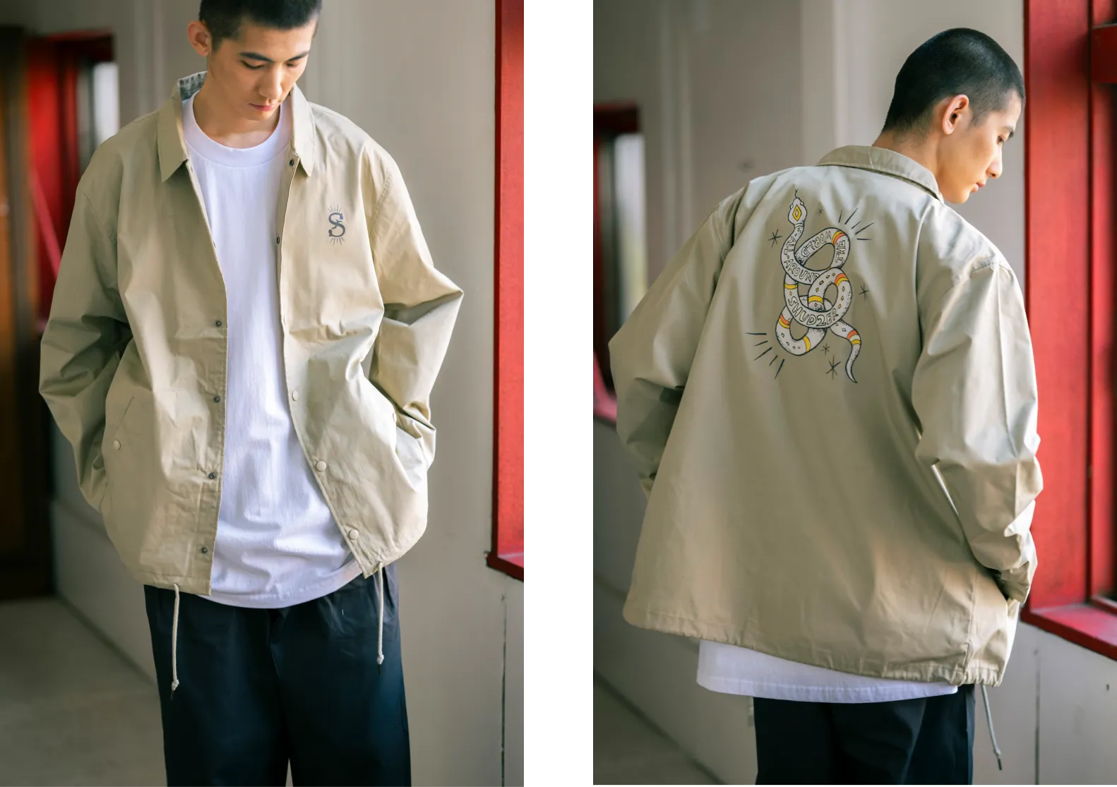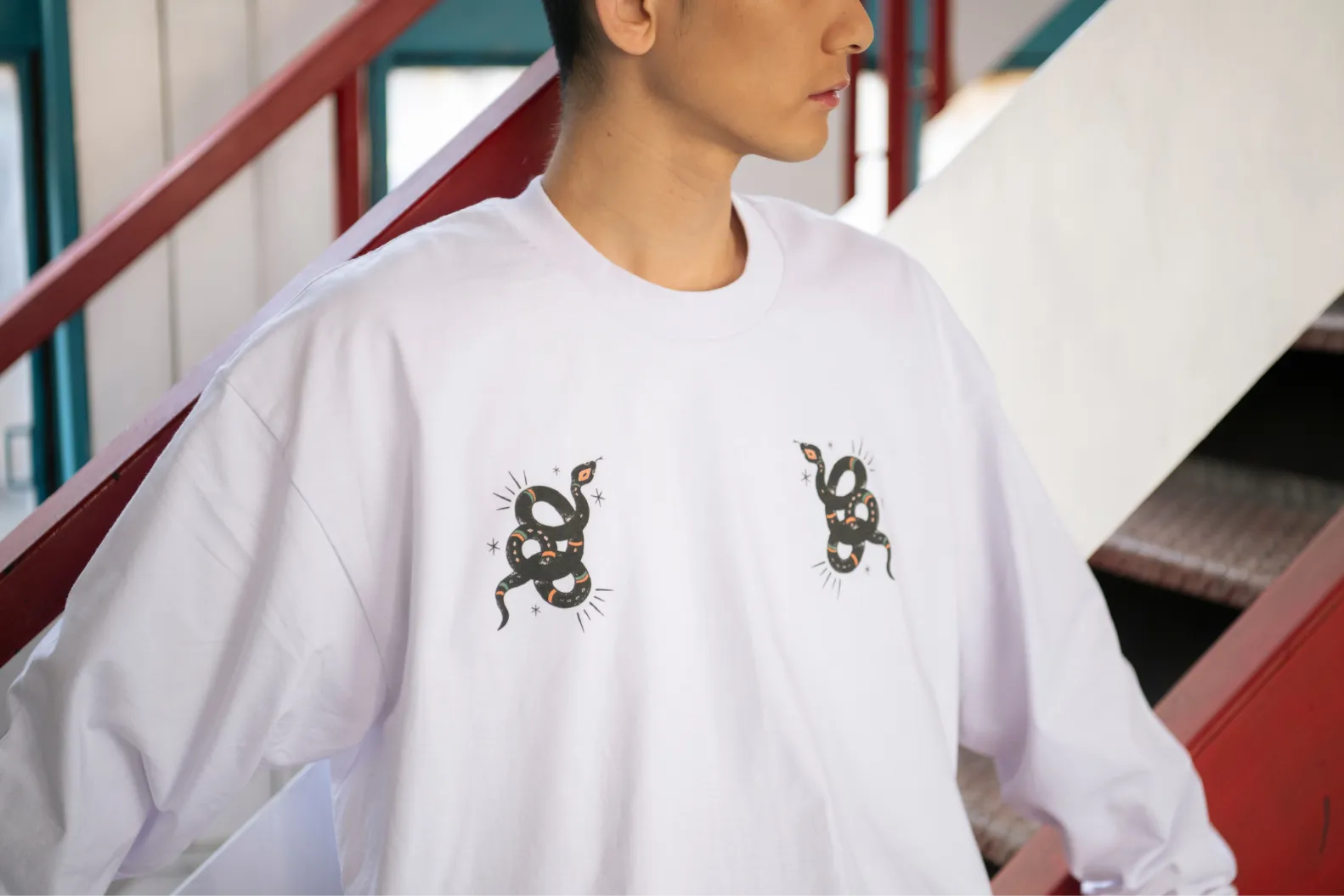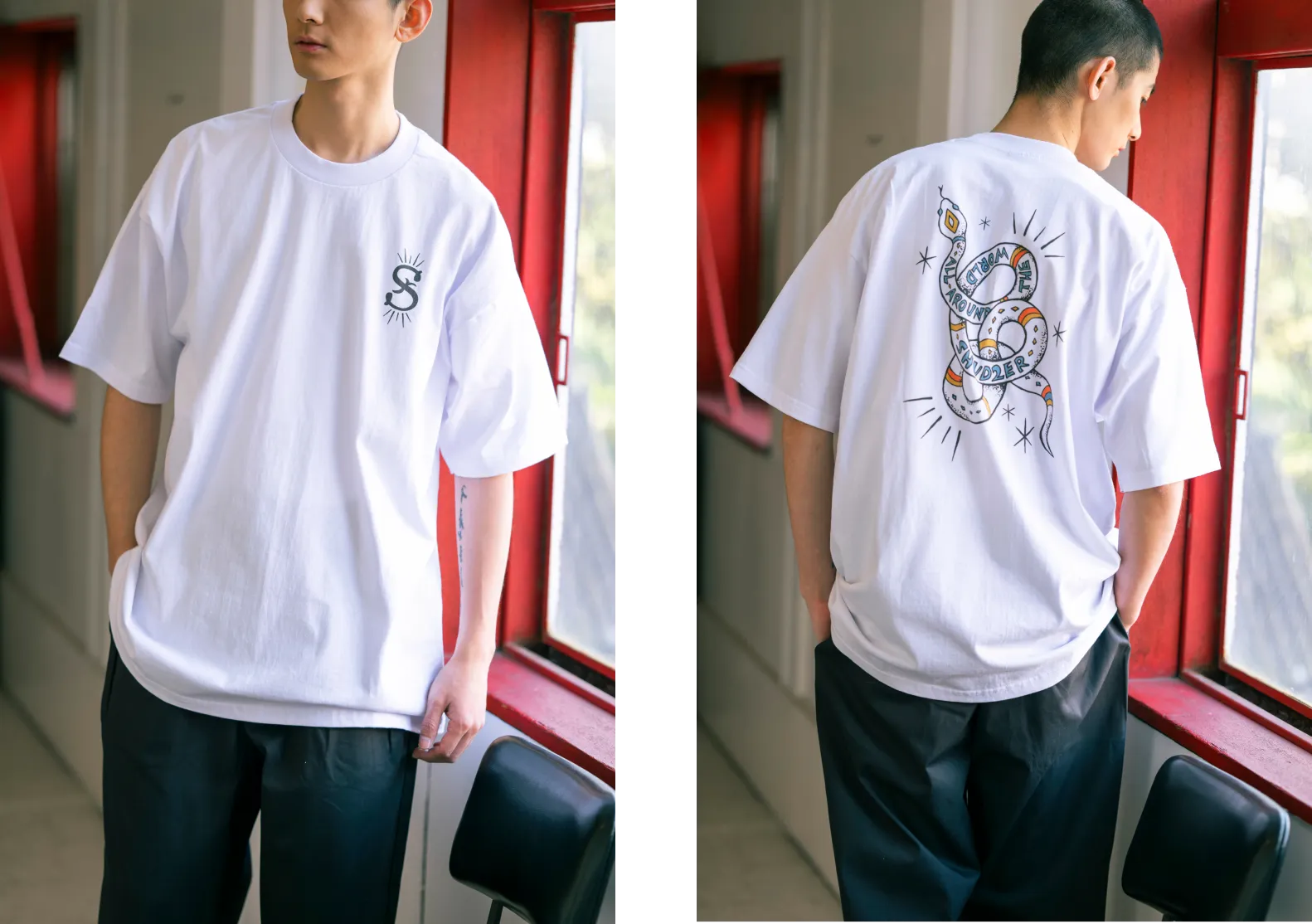 襟ぐりに存在感があるので前のプリントは控えめなロゴを、後ろ姿をかっこよくしたかったので大きなヘビモチーフをあしらいました。