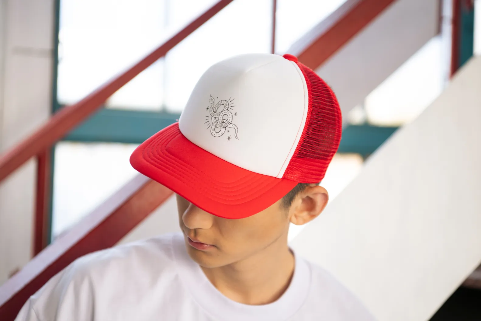 絡まるヘビのモチーフをフロントに施したメッシュキャップ。シンプルでありながら多用途に活躍する定番アイテムです。