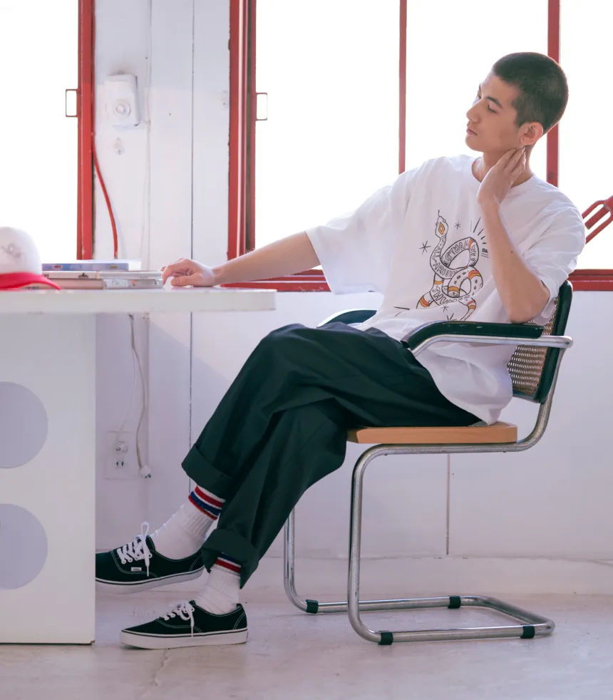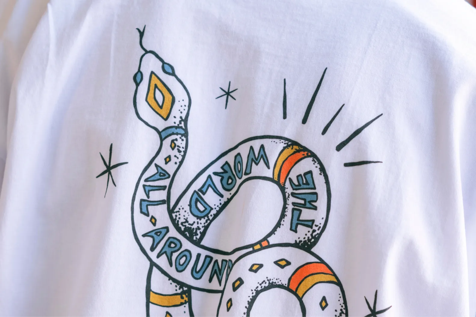 こちらのTシャツにはインクジェットプリントでヘビのイラストをプリント。 柔らかな生地の風合いを残しつつきれいにプリントすることを意識しました。 洗っていくうちにどんどん馴染みが出てよりオリジナルな1着になります。