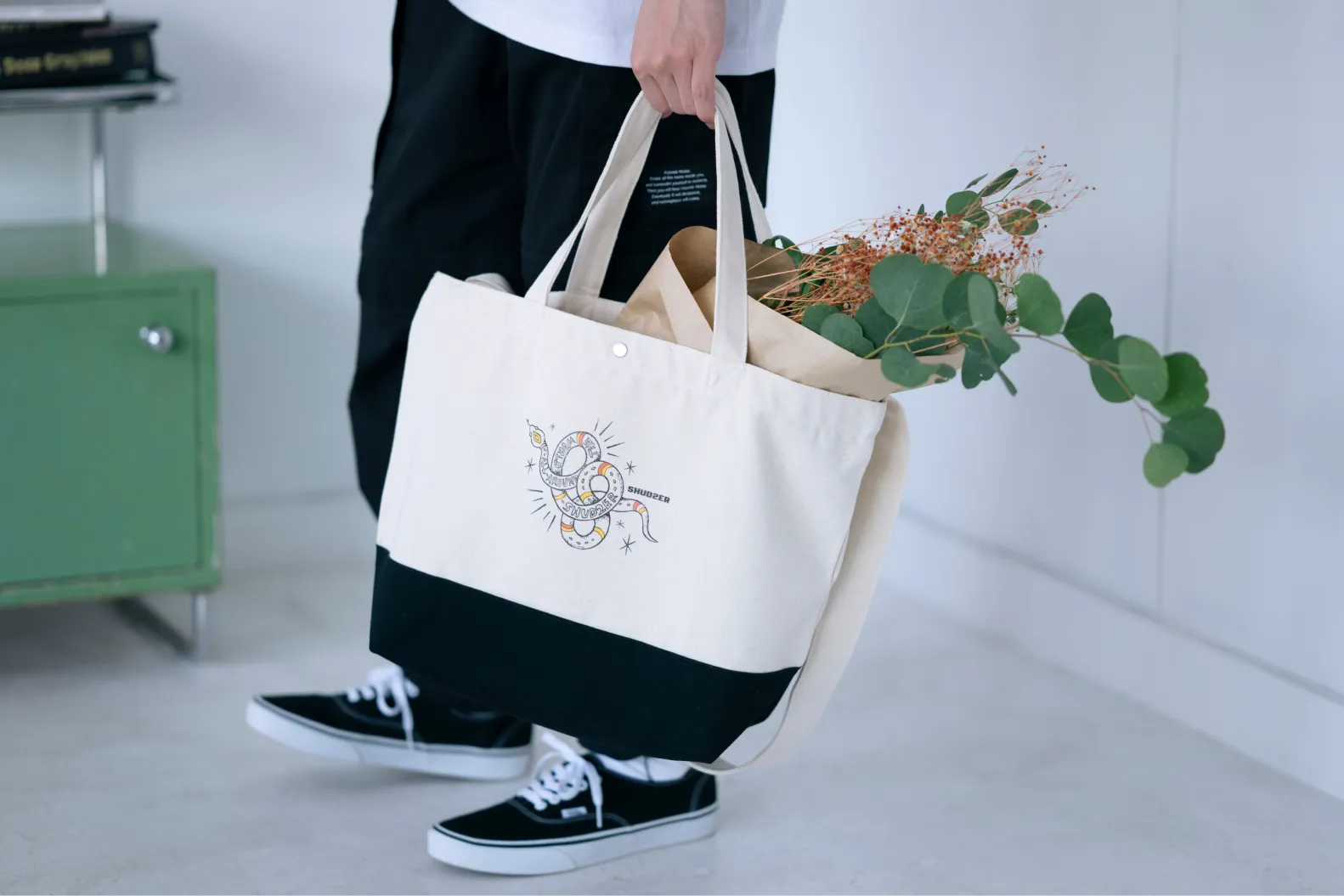 持ち手が2wayになっているので手持ち、肩がけが可能なので荷物の内容や、その日のスタイリングによって雰囲気を変えられるので色々楽しめます。 プリントは横長に入れることができるのでブランドの文字などもバッチリ。