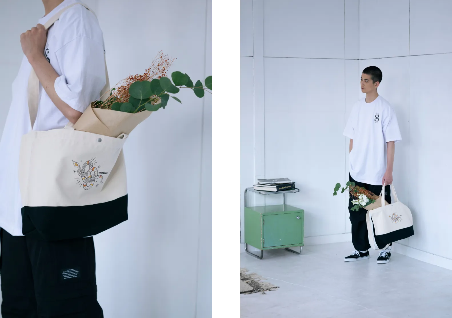 カラー展開は単色のナチュラル、ブラック、バイカラーのナチュラル×ブラック、ナチュラル×ネイビーの4色をご用意。 どのカラーもプリントがよく映える定番カラーです。