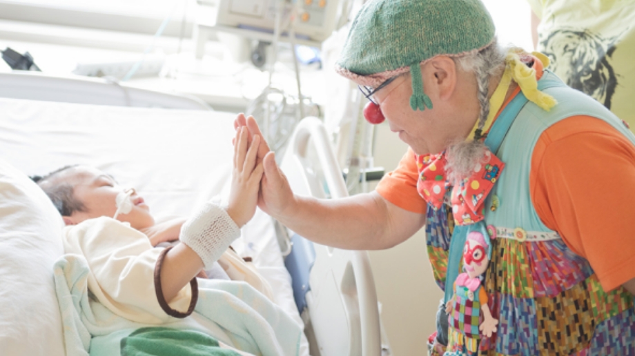 クリニクラウン=臨床道化師。トレードマークの赤い鼻とカラフルな衣装に身を包み、入院生活を送る子供たちの病室を定期的に訪れ、遊びやコミュニケーションを通して成長をサポートするプロジェクト。
