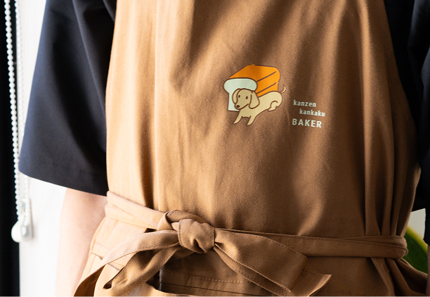 パンとお菓子作りの教室「完全感覚ベイカー」様では、お店のロゴを入れたエプロンとトートバッグを制作。 落ち着いた色合いとしっかりした素材感が、お店の雰囲気にもぴったりです。 販売用としてだけでなく、店内のディスプレイとしてもご活用いただいています。